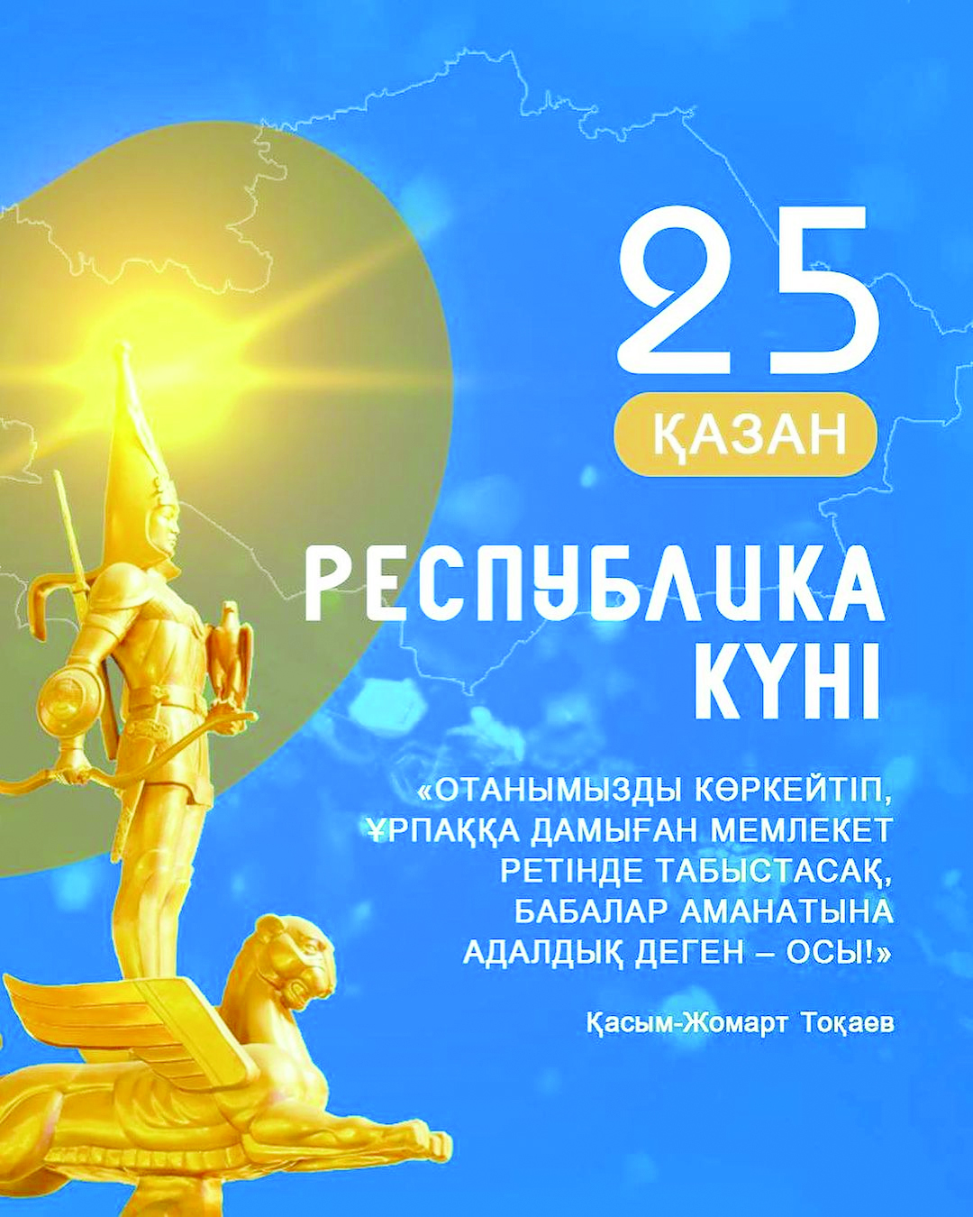 Тарихи мәні терең, идеологиялық жүгі жоғары айтулы күн еліміздің бүгіні мен ертеңіне адал қызмет ететін, ерен істер мен елеулі бастамаларды жалғастыратын барша азаматтың отаншыл рухын оятып, сенім мен жауапкершілік сезімін қалыптастырары заман ақиқаты.